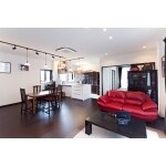 物件は築年数も浅く、構造が耐久性の高い重量鉄骨であることと利便性を考慮し、ご購入をお勧めしました。リフォームに関してのご要望は、「LDKが生活のメイン!一番快適な空間にしたい」、「夫婦二人のライフスタイル中心の間取りにしたい」とのことでした。そこで、各居室は最小限の広さにとどめて、LDKを出来るだけ広く確保しました。さらに主寝室をLDKと隣接させ、普段はオープンな状態でLDKとあわせて使用できるプランをご提案しました。 1階は車2台分だけ車庫として残して倉庫へと改装。主な居住スペースである2階の収納を必要最低限に抑え、生活空間を広々と確保できるようにしました。プランニングのメインのLDKは、約26帖の広さに加えて約2.6mの天井高を確保。さらに大きな掃き出し窓を設置して、高さも含めて広がりを感じられる大空間を造り上げました。また、アクセントに赤色を使いたいというご希望だったため、ベースカラーを白と黒、デザインをシンプルにすることで、赤色がほどよく映えるようご提案しました。