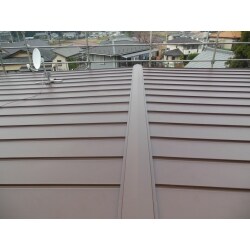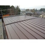 屋根の勾配がゆるいので、瓦棒葺きが適しているのですが 下地の垂木が腐食しやすい事から 通常垂木が下地に使われるところ、木下地の要らない工法でご提案しました。