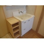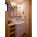 人造大理石のシャンプードレッサー 床板はタモ材 余ったスペースにはサイズを合わせて棚を造作