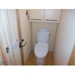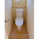 便器上に両開きの収納 床には汚れても水拭き出来るようウレタン処理が施されています。