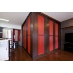 引戸を全開にすると、広々とした見渡しの良いひとつの空間になります。気分やTPOに合わせて、お部屋の雰囲気を変えることが出来ます。 引戸を閉じることで、深みのある茶と鮮やかな赤が映え、シンプルながらも和のテイストの効いた「和」と「洋」の共存する空間へと生まれ変わりました。引戸は実際に色付けした建具を用いながら、何度も打ち合わせを重ね、ご主人様のこだわりを形にしました。