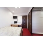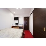 広すぎた寝室は最適な広さへと改装しました。この部屋の色も、LDKと同じく、白・赤・茶でまとめ、統一感を出しました。また、隣の洋室はウォークインクローゼットへと改装し、寝室と繋げました。引戸を開けた奥が、一部屋分ウォークインクローゼットとなっています。クローゼットはこの一ヶ所に集約しました。散在していた収納スペースを一ヶ所にまとめることで、収納効率も格段にアップしました。