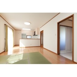 家族が集まりくつろげるよう拡げたLDK。タタミコーナーの段差は解消しました。内装は明るい色を採用したので、より広がりを感じられます。自然と家族が集まる空間になりました。水廻りにも直接アクセスできる動線にし、もちろん敷居の段差も解消しているので、車椅子でもらくらく移動できます。
