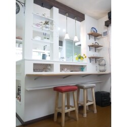 キッチンの向きを変えて、リビングと対面にし、柱を活かした飾り棚やニッチを造作しました。お気に入りの雑貨を飾れるカフェ風のキッチンになりました。