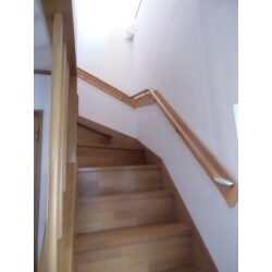 危険の多い曲がり階段に手摺後付け工事のご依頼をいただきました。手摺には力がかかるため補強の幕板をまず取り付け、使いやすい高さに設置することをお勧め致しました。