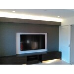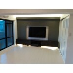 リフォームしてキレイになった壁に、テレビ棚を造作しました。床は防音フローリングに。