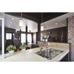 間取り変更後、耐震性能を維持させるよう配置した柱や梁等の構造体は、キッチンカウンターが主役となる部屋の名脇役として、ダークブラウンの空間に違和感なく溶け込ませました。 LDKの壁はレンガ調のクロスを使用しましたが、キッチンのシンク横だけは、天然石の質感が高級感を漂わせるタイルを使用しました。