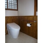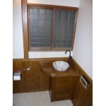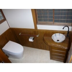 築後60年が経っていましたが、構造が非常にしっかりしていて、大切に住まわれていることが伝わる立派な和風住宅でした。そのため、全てを新しいものと取り替えて今風にしてしまうのではなく、新しい物を『取り入れ』て和風と調和するよう心がけました。トイレには斬新でモダンなデザインの便器を選定しましたが、壁に漆喰を塗り、手洗い器カウンターを杉の一枚板で造作しました。また腰壁には無垢材(ヒノキ)の羽目板を使い、既存廊下の無垢材(カバザクラ)と調和するよう、落ち着きのある色で塗り上げました。