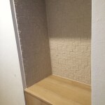 ブラケットライトが優しく照らす飾り棚が印象的なエントランス
