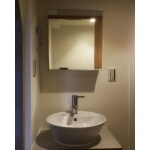 洗面化粧台を置くと圧迫感があるため、ボウルの大きさにあわせて台を造作、鏡を壁に設置しました。