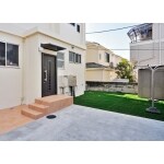 物置とゴミだらけで使えていなかった裏庭が、親世帯のアプローチと人工芝の子供の遊び場へと変貌しました。 表玄関は既存の石貼りを活かして仕上げました。