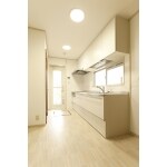 床材は石目帳のクッションフロアです。キッチンの扉材もホワイト色にしてキッチン全体をホワイトでまとめてとても明るい