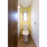 トイレは綺麗だったので既存の物を再利用しました。 内装のみのやり替え、扉の入替でイメージチェンジ。床材は木目調のクッションフロアー、クロスは一面だけアクセントカラーを取り入れました。