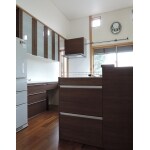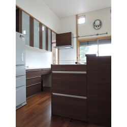 上張りしたフローリングの色に合わせ、濃い木目のキッチン廻りになりました。レンジフードも扉と同じ化粧パネルで統一感を出しました。ダイニング側の組み込み棚にも小物が沢山置いておけます。