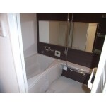 ユニットバスのアクセントパネルは、室内全体の色調に合わせダークウッド調に。横長のワイドミラー設置により、少しでも広がりが感じられるようにしました。 天井には浴室暖房乾燥機も設置し、夏の暑さや冬の寒さも軽減されるはずです。