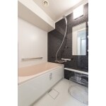 ブラックのアクセントパネルに浴槽のピンクとの組み合わせがオシャレ感を醸し出しています。
