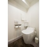 インテリアのイメージはやはり同様でしたが、狭い空間のトイレは床の色味を押えて統一しました。