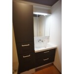 洗面化粧台とあわせてトールキャビネットを設置。 収納力もUPし、一体感のある洗面スペースが実現できました。