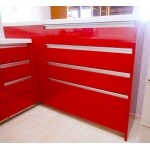【ダイニングスペース収納】ダイニング側のカップボードの扉柄は、あえて、既存の家具と馴染むよう落ち着いた色目に。赤と茶のコントラストが綺麗です。