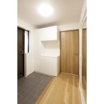 玄関を入ったところに大きな鏡を設置。玄関収納はパナソニックのベリティス。建具も全てパナソニックのベリティスです。フローリングはLDKと合わせて朝日ウッドテックを施しました。