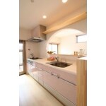 (旧株式会社ハウスドゥでの事例です。)キッチンとダイニングの間にはアーチを描く垂壁を。 角のないデザインとさくら色のキッチンがやわらかさを演出。
