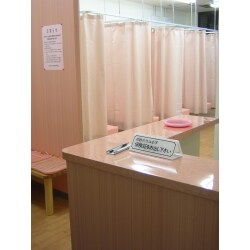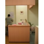 院内にはカーテン以外に間仕切りを作らず、開放的な室内になっています。カウンターは待合室も診察室も見通せる位置に低めに設置、コストダウンのためにクロスを利用しています。