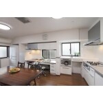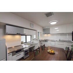 | その他採用機器・設備 | オーダーキッチン 座ったままでも調理ができる。カウンター高さは、700㎜。 水はねの気にならない深型タイプのシンクを選定。 コンロでの作業もしやすいように、けこみ部分を170mm奥にして足が入るように計画。 金物はBlum社のもので、静かに閉まるブルモーション機能付き。 |