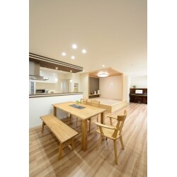 ・6人掛けのテーブルを置いても余裕があり、4世代が集まってもテーブルと和室を囲んで十分集える空間を確保しました。 ・小上がり和室の畳下には大容量の引き出し収納を製作し、効率よく収納を確保。
