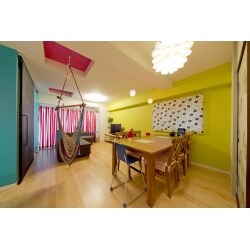 間取りは開放的にして、生活導線を気にしながらご提案させて頂きました。 とてもカラフルがお好きなご家族でしたので、できる限りのご要望に近づけながら、過去の経験も活かしおすすめできることをご提案致しました。 ハンモックの設置ははできれば。。。というくらいのご要望でしたが、ぜひやりましょう!と私たちも積極的にご案内させて頂きました。