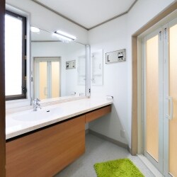 (旧株式会社LIXILリニューアルでの事例です。)浴室とつながっているサウナを活かすために、在来工法でタイル張りの浴室にしました。明るさの確保と清潔感を重視しました。 洗面室は窓を活かしつつ大きな鏡を設置し広さと高級感を演出しました。すわりながらゆったりできる化粧台がポイントです。 トイレは入口を広くし、段差解消など高齢者に十分配慮しました。
