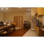 天井はLEDダウンライトや間接照明でライン照明を配置して在庫商品がしまえるようにLIXILTASBOXを両サイドに配置しました。 入口正面の壁にはアクセントクロスでインパクトを出してあります。