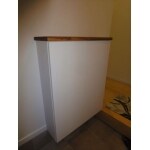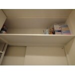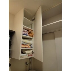 以前はつっぱり棒や市販の収納ユニットを使ってタオルなどを収納していました。 今回扉上にカウンターを、洗濯機上にはオーダーの収納家具を設置しました。 よく使うものはオープンのところに、隠したいものは扉付きのところに収納でき以前よりもスッキリしました。