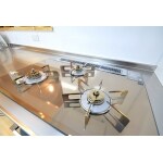 手前の木製カウンターはお菓子作りなど調理作業台となっております。カウンター奥に冷蔵庫が設置されており、ダイニングからは見え難くしております。右側の家電収納部にも収納が沢山有りますので、キッチン本体の吊戸棚の収納量をこちらでも確保しております。白を基調として明るく清潔感のあるキッチンスペースです。