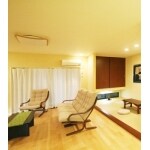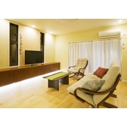 (旧株式会社ハウスドゥでの事例です。)お客様のご希望通りに診療所とDKをつなげ、大きなリビングに。 以前は診療所だった部屋の窓を大きな掃き出し窓にして、日中の光を沢山取り込めるようにご提案。 リビングには、ご主人様のご希望されていた畳コーナーを作り、収納は吊押入にすることで圧迫感を無くし、床の間のようにちょっとした季節のものを飾って頂けるスペースや、格子で空間を区切ることをご提案。 壁には和の雰囲気に合う生成の色の珪藻土を使い、床材は上品な趣のある樺桜をご採用することで和モダンな空間を演出。 TVボードをご提案し壁面に木のなぐりの板をはり、照明で立体感がでるようにデザイン。