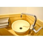・タンクレスタイプにすることで空間を広げられました。また、その空間を利用して、新たに檜のカウンターを設置してデザイン手洗い器を設けることが出来ました。こだわりの空間を檜と漆喰で演出。