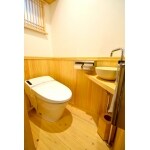 ・奥行きが狭いため、タンクレスタイプのトイレを採用。 ・和のイメージを創るために、床と壁面は檜の腰板張りとし、上部は漆喰塗。 ・イメージの格子障子を新規に造作。