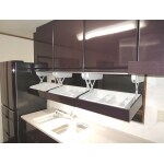 メーカー比較をして、一番ご要望に合うものを選びショールームでご確認いただきました。また、背面収納も両面から使用可能にするために、規格品と造作の組み合わせでプランを練り提案させていただきました。