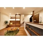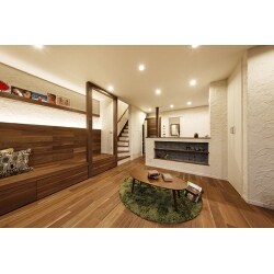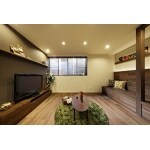 (旧株式会社ハウスドゥでの事例です。)空間を遮っていた階段を移動させ、リビング階段にすることで広いLDKを確保し、あこがれの対面キッチンが実現。 LDKにソファ兼収納スペースの小上がりを造作。背面を間接照明で照らし、やわらかい光がくつろぎ空間を演出。 床は1、2階とも無垢材の複合フローリングをご提案、床の色に合わせて棚やアクセントクロスをご選定し、全体に統一感のある落ち着いた空間に。