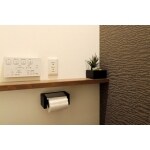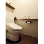 (旧株式会社ハウスドゥでの事例です。)トイレ背面には棚を、サイドにはカウンターを造作。 カウンター部分のコンセントで携帯電話の充電ができるように。また、壁にはLDKと同じアクセントクロスを貼り、落ち着いた雰囲気のトイレ空間に。