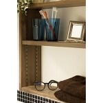 (旧株式会社ハウスドゥでの事例です。)洗面台を造作し、下部にはオープンな収納を設置することをご提案。お子様の靴下などを手洗いしやすいよう、深めの洗面ボウルをご選定。LDKのニッチに使用した物と同じタイルを貼り、鏡の後ろには間接照明を仕込みました。 洗面台横の壁には、歯ブラシなどを置くことができるニッチを造作。