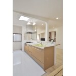 広いスペースを活かし、LDKの中央に設けたキッチンは、吊戸を無くし、2列型で家電収納を含むたっぷりの収納を設置。窓前に調理補助としても使える長いカウンターと、出し入れしやすい引き出し式で使い勝手のいいシステムを提案。また対面にはカウンターを設け、ちょっとした食事をしたり、お子様の話を聞いたりと、自然に会話が生まれるスペースになっています。