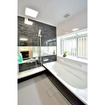 1616へサイズUPした浴室は、サイズUP分そのまま出窓も大きくなり、更にゆったりした浴室空間に感じます。アクセントパネルとエプロンの黒が全体を引き締めます。