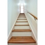 踏み板と蹴込板の色を変えて明るくおしゃれになった階段。手摺も木製になり、すっきり明るくなりました。