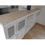 キッチンカウンター天板には、奥様にお選びいただいたモザイクタイルを貼り、木目部分は白色で塗装。中央の扉は撤去しました。 LDKの床には既存床の上に床暖房を設置、部屋を明るくしたいとのご希望でしたので、床の色も比較的明るい印象のものをお選びいただきました。