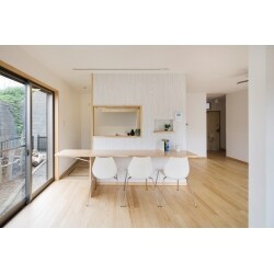 最初は3パターンくらいプランを見ていただいて、ご夫婦の反応や感触を確かめながらご提案させていただきました。最終的に「これだ!」というプランに行き着いたのがこのプランです。 リビングダイニングには無垢の床板を張り、気持ち良く素足で生活できる住まいになりました。 リビングダイニングの窓からはご両親のご実家が見えます。出来あがった時に、お孫さんが嬉しそうにおじいちゃんに手を振っている様子が印象的でした。