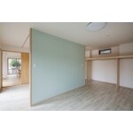 寝室と子供部屋は真ん中の耐震壁を残して一続きの空間としました。北側に全面収納をとり、あとはフリーに使えるように間仕切り等もありません。中央の壁の表と裏でクロスの色を変えることで寝室と子供部屋のイメージを変えました。