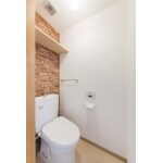 トイレはもちろん節水型に。レンガ調のクロスは「アメリカンな感じにしたい」というご主人のこだわりです。 棚は建具と同じシナ材で作成。レンガの自然なイメージとマッチさせました。
