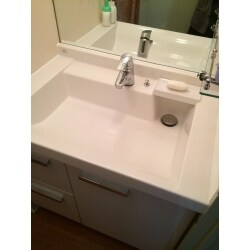 もともとキレイな一面鏡がありましたので、それはそのまま活かしながら、洗面台の下台のみ交換させていただきました。奥様からは、洗い場が広いこと、収納が充実していることを、高級感のあるデザインであることをご希望いただいたため、LIXILのミズリアでご提案致しました。ミラーキャビネットがない分の収納は、壁の側面にガラス製の簡易棚を取付けることで解消しました。