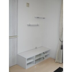 造作のテレビ台はお客様ご希望のデザインで。 ご希望のお色にするため、ダイノックシートを木材に張り 造作しました。 白を基調に統一されて明るくなりました。