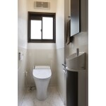 (旧東京ガスリモデリング株式会社での事例です。)1階のトイレはタンクレスのトイレを設置。壁はお掃除がしやすいように、腰高の高さまでパネルを設置。壁面に収納・手洗い器を設置いたしました。